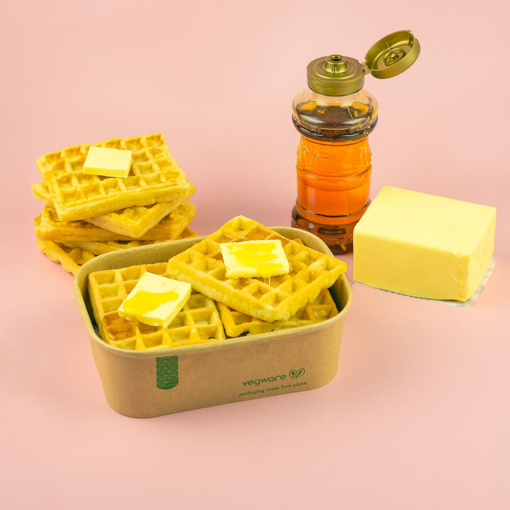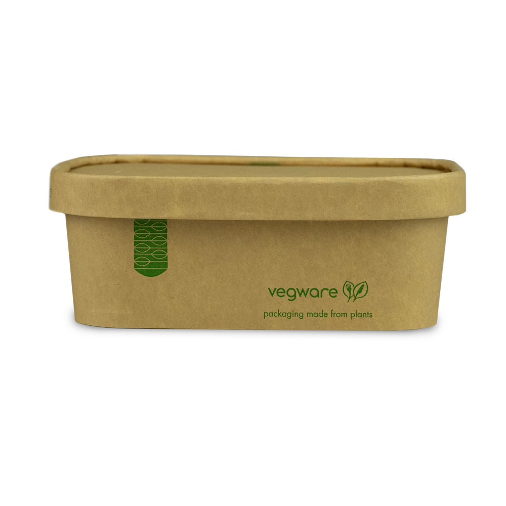 This eco-friendly rectangular paper food container holds 24oz (750ml) and is suitable for both hot and cold foods. It features a natural kraft brown design with green eco messaging and Vegware Green Leaf Tab. The paper is sustainably sourced and lined with a water-based aqueous material. Lids for hot (lined paper) and cold (clear PLA) foods are sold separately.