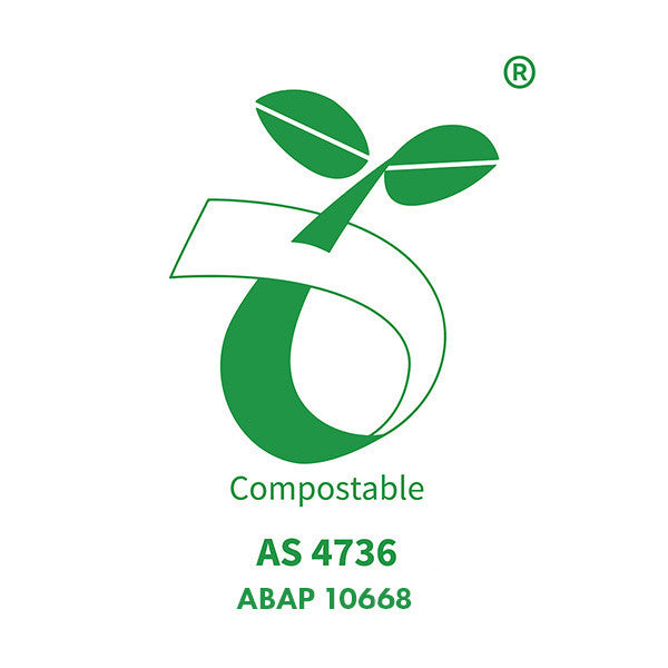 Certified commercially compostable to the Australian Standard AS 4736 by the Australasian Bioplastics Association (ABA), where facilities exist.