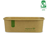 This eco-friendly rectangular paper food container holds 24oz (750ml) and is suitable for both hot and cold foods. It features a natural kraft brown design with green eco messaging and Vegware Green Leaf Tab. The paper is sustainably sourced and lined with a water-based aqueous material. Lids for hot (lined paper) and cold (clear PLA) foods are sold separately.