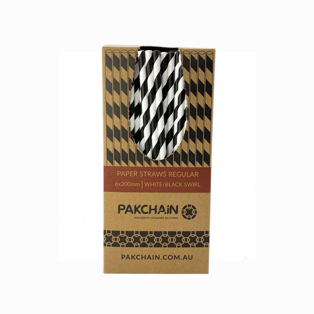 Paper Straws Regular 6 x 200mm - White/Black Swirl (Box)